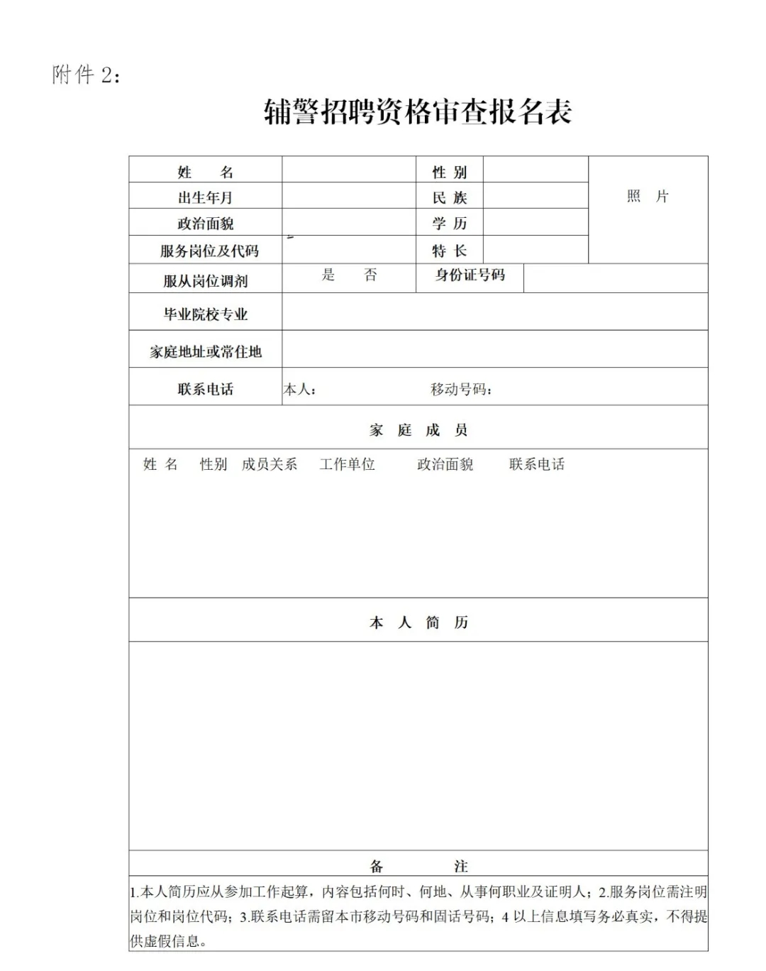 3.報(bào)名方式:以現(xiàn)場(chǎng)報(bào)名的方式進(jìn)行。報(bào)名時(shí)應(yīng)攜帶本人身份證、戶口薄、學(xué)歷證明的原件和復(fù)印件、近期2寸免冠彩色照片2張及《警務(wù)輔助人員報(bào)名表》(見附件2,請(qǐng)自行下載并填寫完整)。