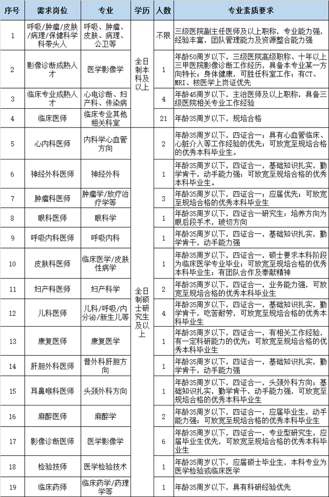 3、 “招聘崗位及要求”中未列出的專業(yè)崗位,優(yōu)秀碩士及以上研究生和已規(guī)培人員也可以電話咨詢或報名。