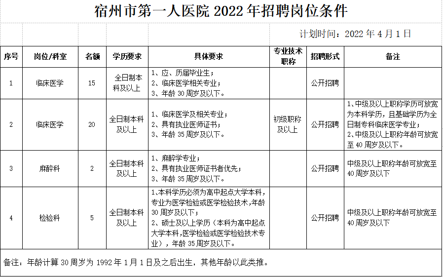 三、招聘崗位:具體詳見(jiàn)《宿州市第一人醫(yī)院2022年招聘崗位條件》