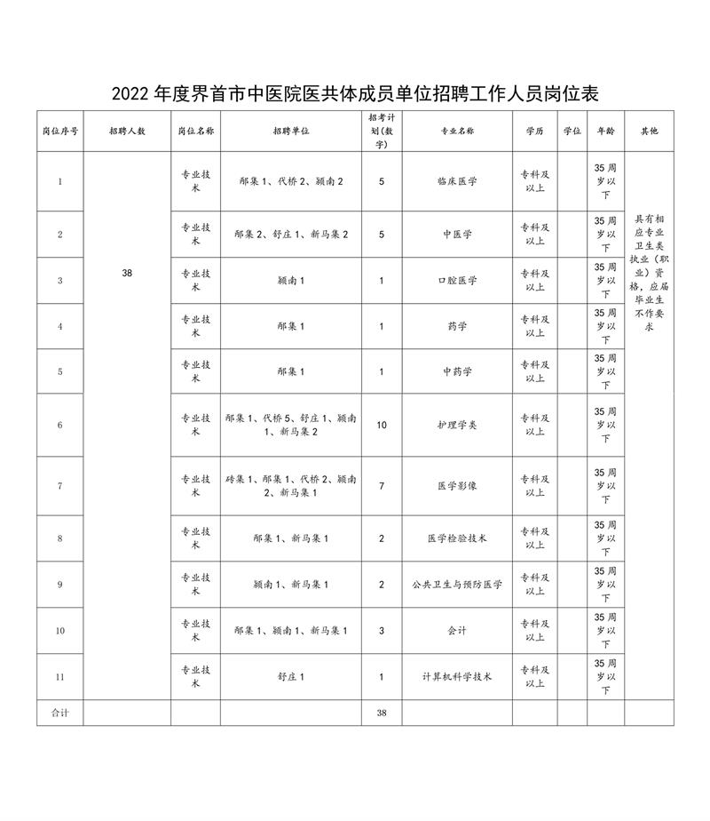 本次計(jì)劃公開招聘工作人員38人,具體招聘崗位、人數(shù)、專業(yè)、報(bào)考條件等詳見《2022年度界首市中醫(yī)院醫(yī)共體成員單位招聘工作人員崗位表》。