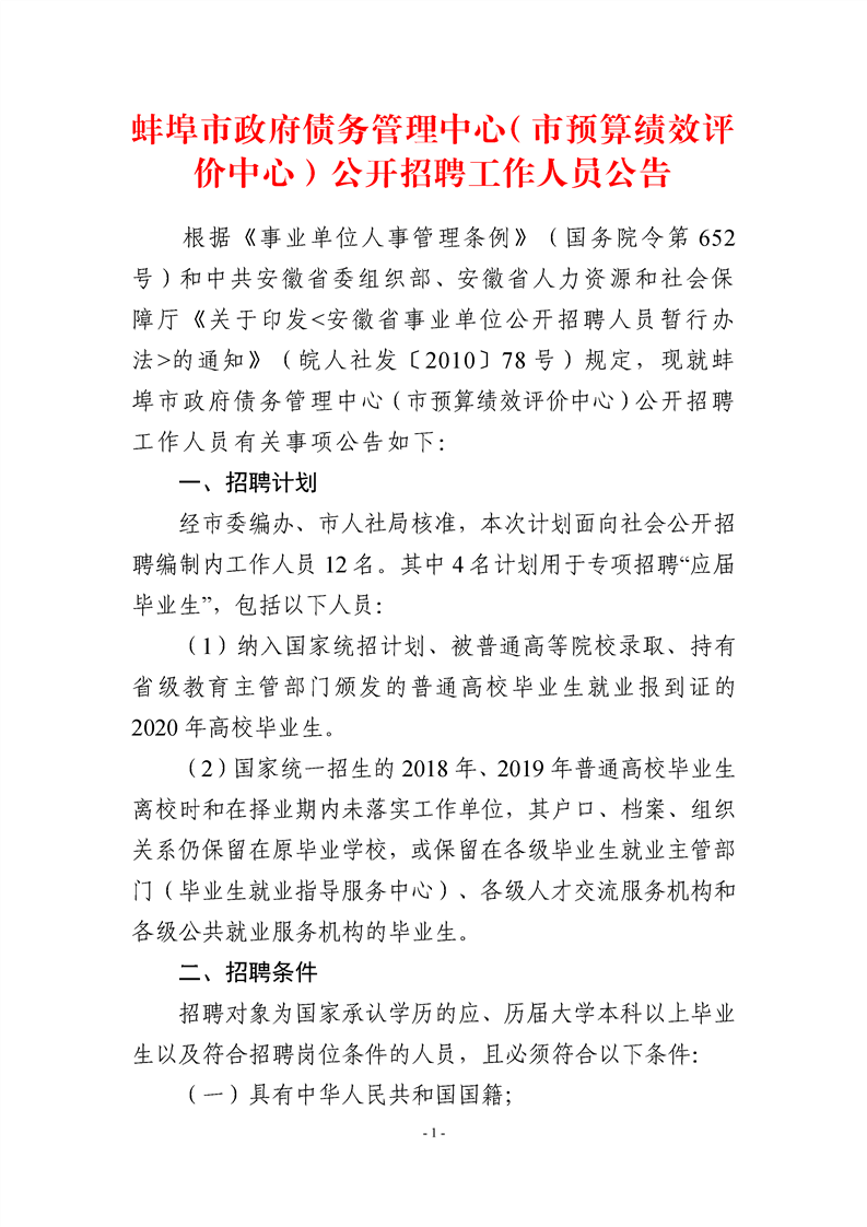 原標(biāo)題:2020年蚌埠市政府債務(wù)管理中心(市預(yù)算績效評價(jià)中心)公開招聘工作人員公告
