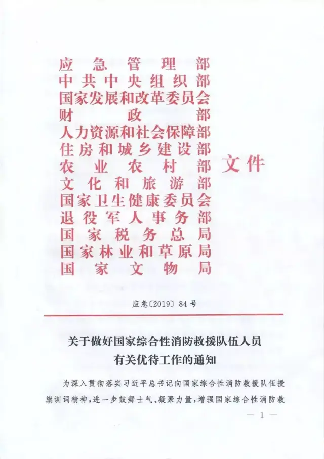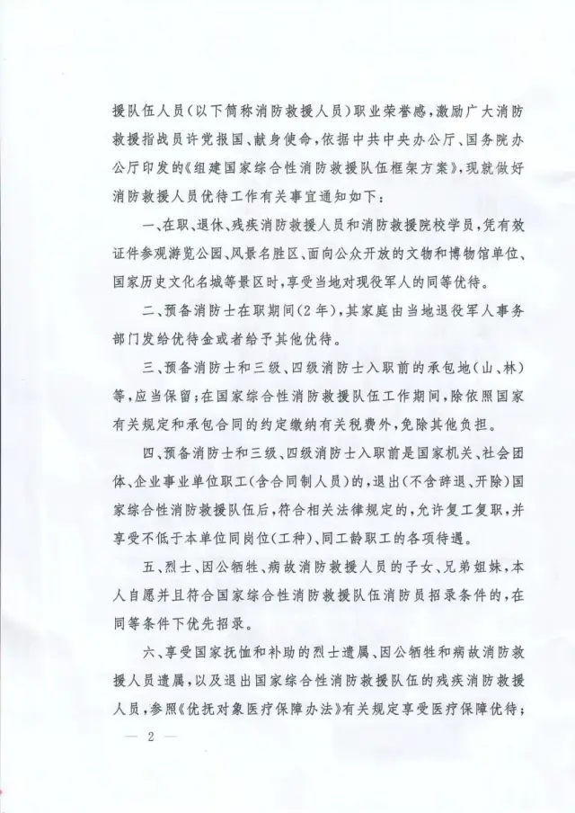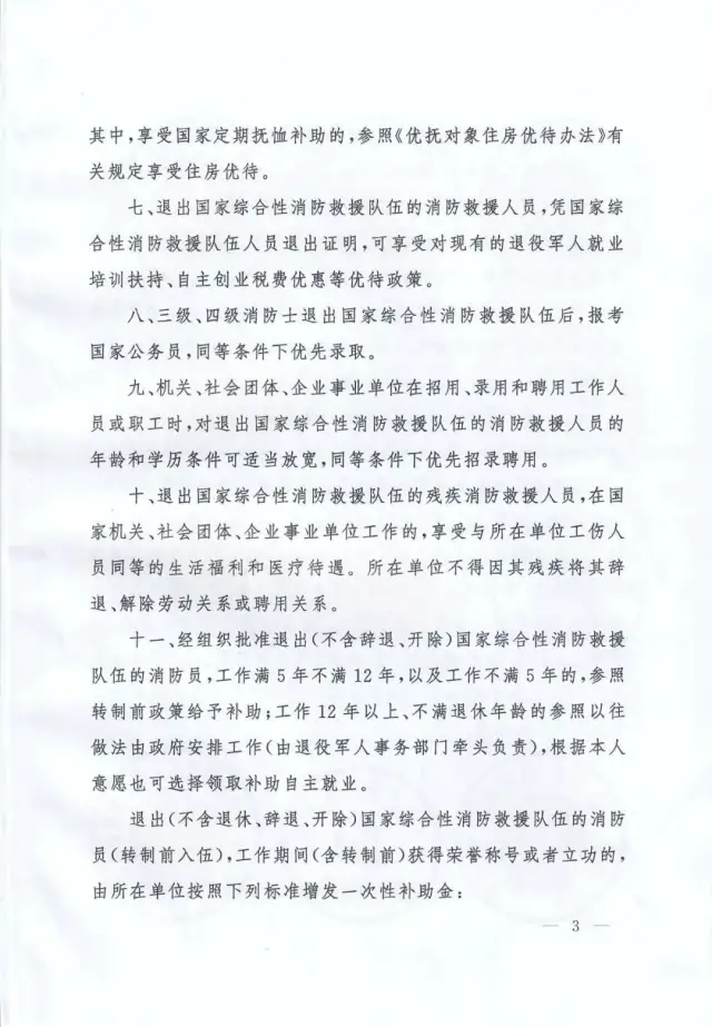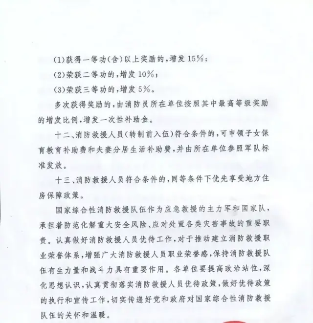 國家發(fā)展改革委員會、教育部、財政部、人力資源社會保障部、交通運輸部、退役軍人事務(wù)部等部委與應(yīng)急管理部聯(lián)合出臺的《關(guān)于做好國家綜合性消防救援隊伍人員有關(guān)優(yōu)待工作的通知》(應(yīng)急〔2019〕84號)、《關(guān)于保障國家綜合性消防救援隊伍人員交通出行優(yōu)待權(quán)益有關(guān)事項的通知》(交運規(guī)〔2019〕4號)等文件,明確國家綜合性消防救援隊伍人員在傷亡撫恤、退出安置、就業(yè)創(chuàng)業(yè)、家庭優(yōu)待、子女入學(xué)、住房醫(yī)療、交通出行、參觀游覽等方面享受專門優(yōu)待政策。