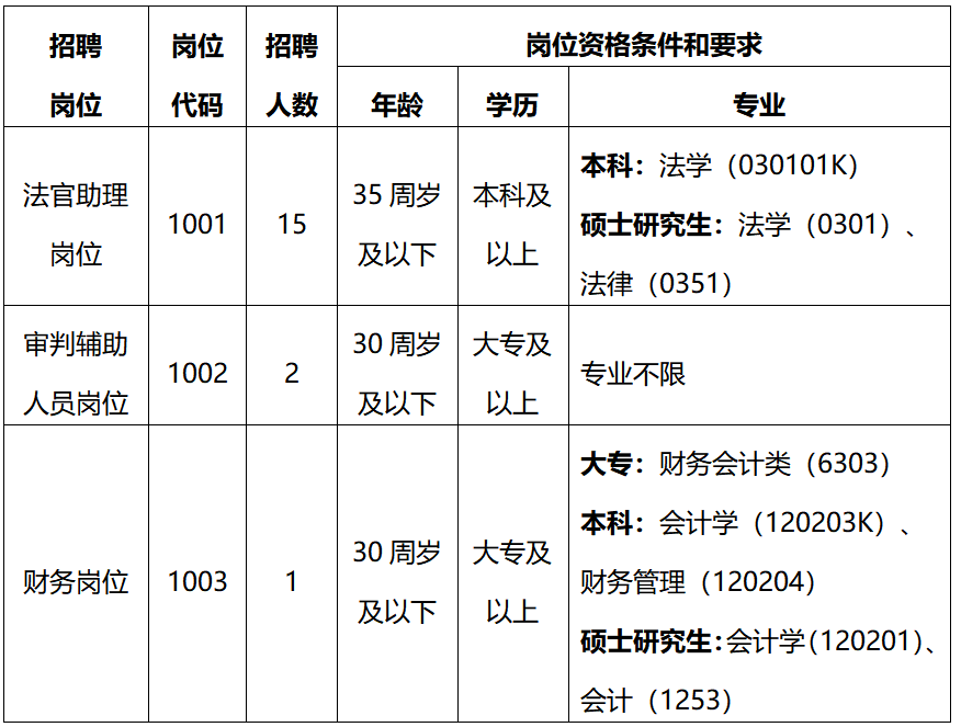 2.根據(jù)審判工作專業(yè)化需要,審判輔助人員崗位(1002崗)法律專業(yè)大專學(xué)歷(法律實務(wù)類專業(yè)代碼:6805)的在筆試成績基礎(chǔ)上加2分,法律專業(yè)本科及以上學(xué)歷(本科法學(xué)專業(yè)代碼:030101K、研究生法學(xué)專業(yè)代碼:0301、0351)的在筆試成績基礎(chǔ)上加3分,學(xué)歷加分不累加。