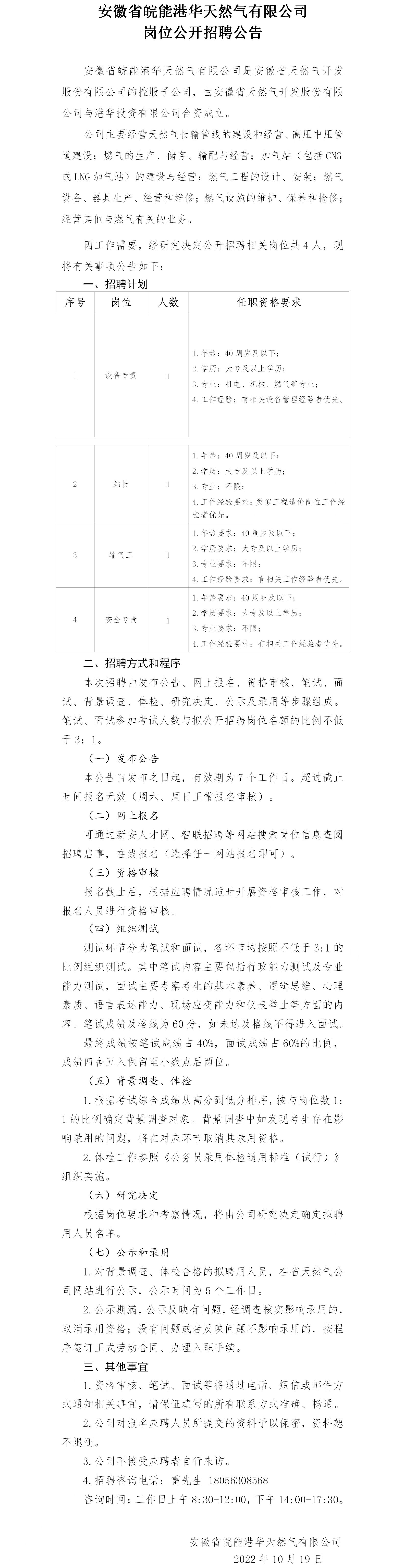 2022年安徽省皖能港華天然氣有限公司崗位公開(kāi)招聘公告