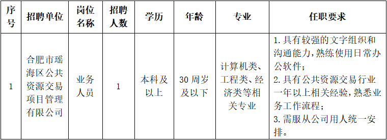 因工作需要,合肥市瑤海區(qū)公共資源交易項目管理有限公司計劃面向社會公開招聘業(yè)務人員1名,現(xiàn)就有關事項公告如下: