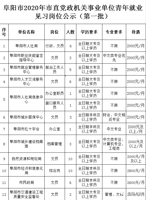 為提高高校畢業(yè)生的就業(yè)能力,根據(jù)安徽省人社廳《關(guān)于印發(fā)安徽省就業(yè)見習(xí)管理辦法的通知》(皖人社發(fā)[2017]54號)和安徽省人社廳等三部門聯(lián)合下發(fā)的《關(guān)于做好2020年機(jī)關(guān)事業(yè)單位就業(yè)見習(xí)工作的通知》(皖人社秘﹝2020﹞98號)精神,阜陽市面向市直黨政機(jī)關(guān)、事業(yè)單位(含公益一類和參公事業(yè)單位)征集就業(yè)見習(xí)崗位,吸納畢業(yè)兩年內(nèi)未就業(yè)的高校畢業(yè)生參加就業(yè)見習(xí)。現(xiàn)公告如下: