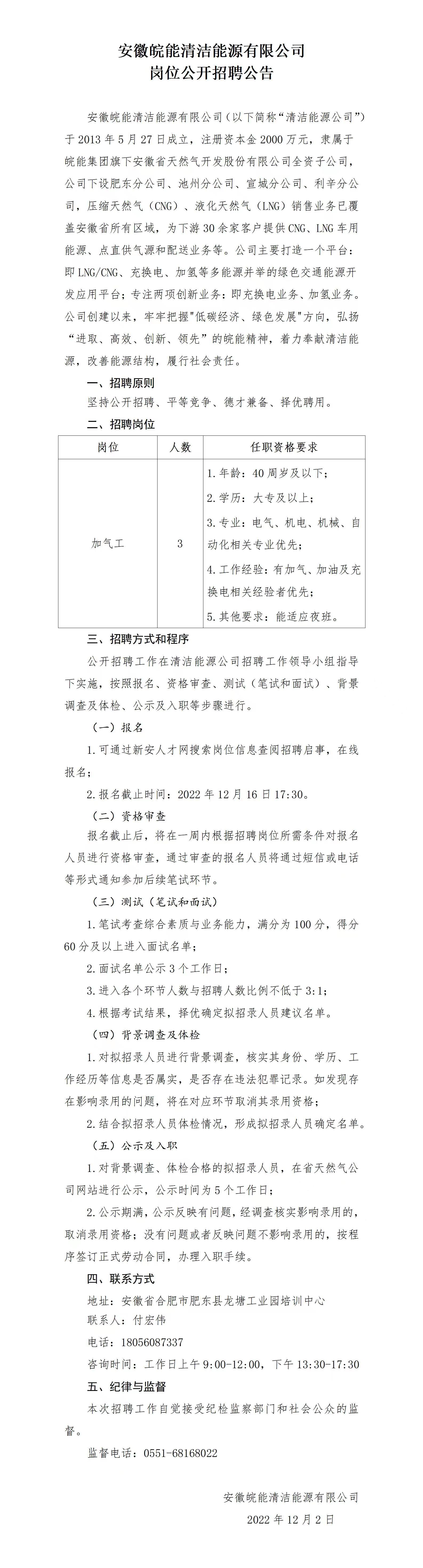 2022年安徽皖能清潔能源有限公司崗位公開招聘公告
