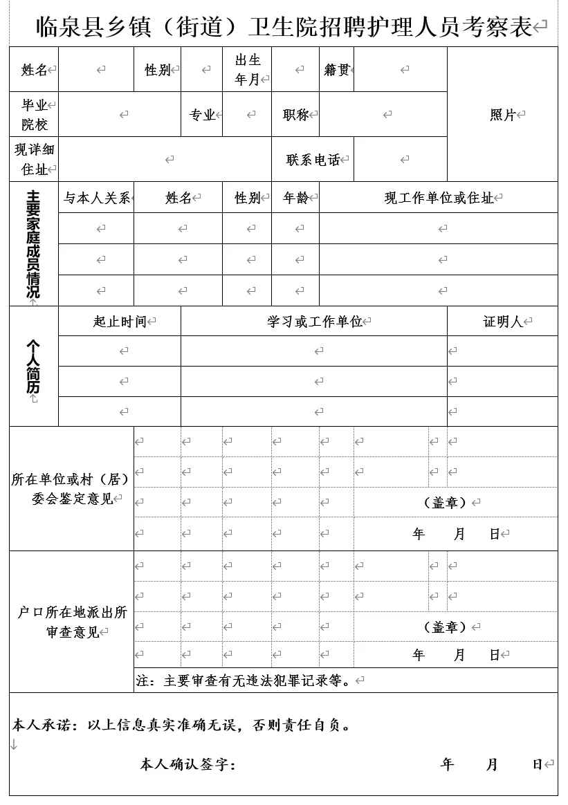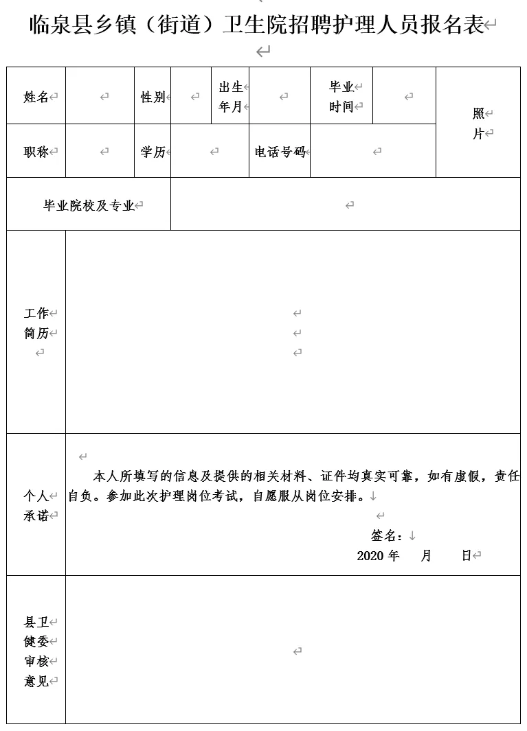 1、臨泉縣鄉(xiāng)鎮(zhèn)(街道)衛(wèi)生院招聘護(hù)理人員報名表