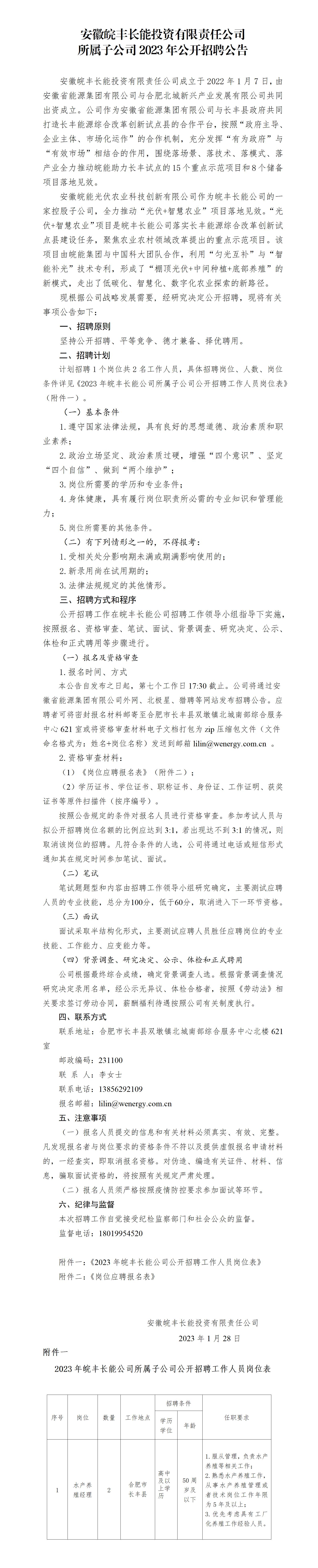 2023年安徽皖豐長能投資有限責任公司所屬子公司公開招聘公告