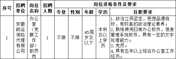 安徽皖運保險代理有限公司,成立于2012年,位于安徽省合肥市,是一家以從事保險業(yè)為主的企業(yè)。為適應(yīng)發(fā)展需要,更廣泛地選拔優(yōu)秀人才,經(jīng)研究決定,委托遠創(chuàng)人力資源管理集團有限公司公開招聘1名工作人員?,F(xiàn)將有關(guān)事宜公告如下: