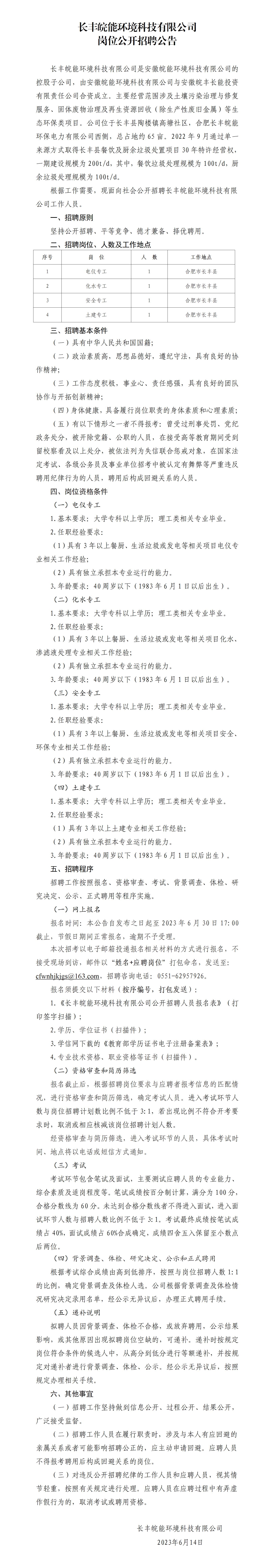 根據(jù)工作需要,現(xiàn)面向社會(huì)公開招聘長(zhǎng)豐皖能環(huán)境科技有限公司工作人員。