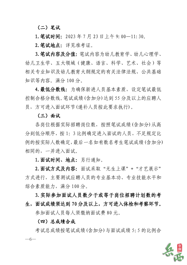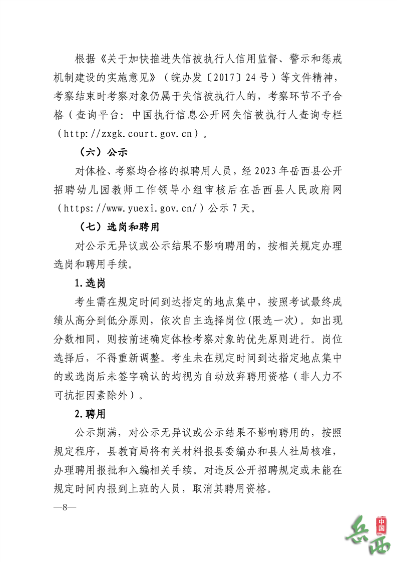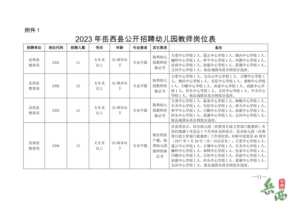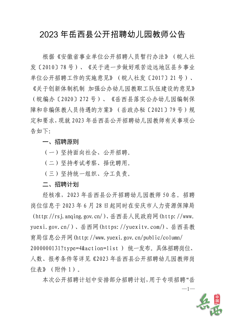 2023-06-28 19:11:22閱讀()岳西縣人民政府根據(jù)《安徽省事業(yè)單位公開招聘人員暫行辦法》(皖人社發(fā)〔2010]78號)、《關于進一步做好艱苦邊遠地區(qū)縣鄉(xiāng)事業(yè)單位公開招聘工作的實施意見》(皖人社發(fā)〔2017〕21號)、《關于創(chuàng)新體制機制加強公辦幼兒園教職工隊伍建設的意見》(皖編辦〔2020〕272號)、《岳西縣落實公辦幼兒園編制保障和非編保教人員待遇的方案》(岳政辦秘〔2021] 79號)規(guī)定和要求,現(xiàn)就2023年岳西縣公開招聘幼兒園教師有關事項公告如下: