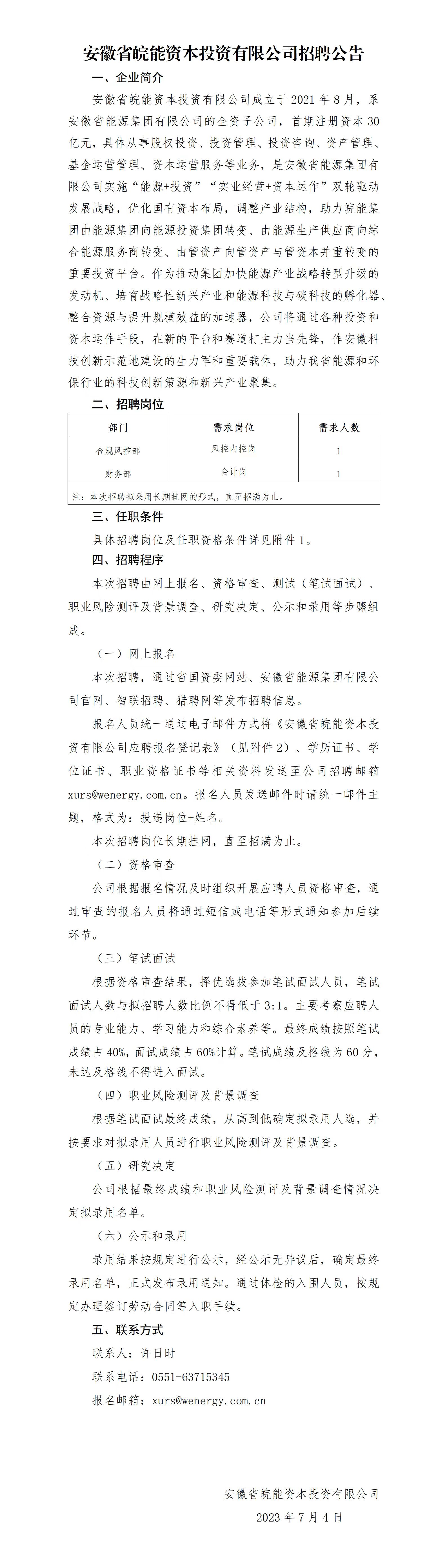 安徽省皖能資本投資有限公司成立于2021年8月,系安徽省能源集團(tuán)有限公司的全資子公司,首期注冊資本30億元,具體從事股權(quán)投資、投資管理、投資咨詢、資產(chǎn)管理、基金運(yùn)營管理、資本運(yùn)營服務(wù)等業(yè)務(wù),是安徽省能源集團(tuán)有限公司實(shí)施“能源+投資”“實(shí)業(yè)經(jīng)營+資本運(yùn)作”雙輪驅(qū)動發(fā)展戰(zhàn)略,優(yōu)化國有資本布局,調(diào)整產(chǎn)業(yè)結(jié)構(gòu),助力皖能集團(tuán)由能源集團(tuán)向能源投資集團(tuán)轉(zhuǎn)變、由能源生產(chǎn)供應(yīng)商向綜合能源服務(wù)商轉(zhuǎn)變、由管資產(chǎn)向管資產(chǎn)與管資本并重轉(zhuǎn)變的重要投資平臺。作為推動集團(tuán)加快能源產(chǎn)業(yè)戰(zhàn)略轉(zhuǎn)型升級的發(fā)動機(jī)、培育戰(zhàn)略性新興產(chǎn)業(yè)和能源科技與碳科技的孵化器、整合資源與提升規(guī)模效益的加速器,公司將通過各種投資和資本運(yùn)作手段,在新的平臺和賽道打主力當(dāng)先鋒,作安徽科技創(chuàng)新示范地建設(shè)的生力軍和重要載體,助力我省能源和環(huán)保行業(yè)的科技創(chuàng)新策源和新興產(chǎn)業(yè)聚集。