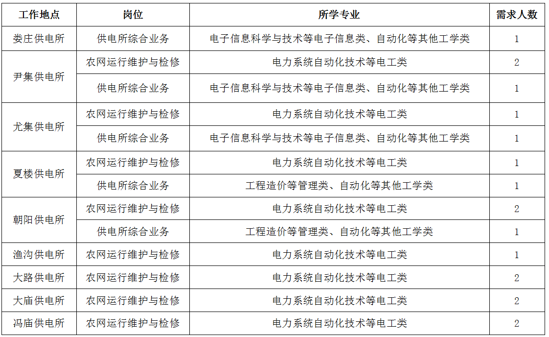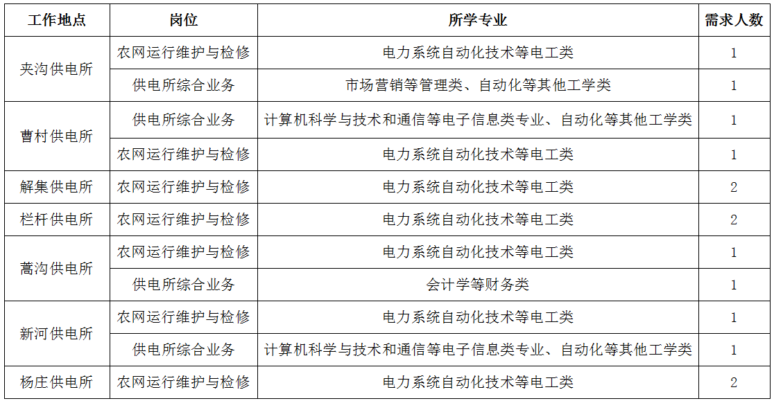 公司計(jì)劃招聘79人,派駐至鄉(xiāng)鎮(zhèn)供電所從事農(nóng)電崗位工作,其中農(nóng)網(wǎng)運(yùn)行維護(hù)與檢修崗位需登桿作業(yè),限招男生。
