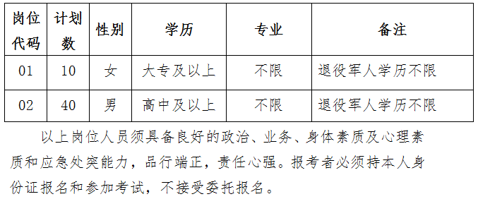 根據(jù)公安工作需要,面向社會(huì)公開(kāi)招聘50名警務(wù)輔助人員。具體崗位及要求如表所示: