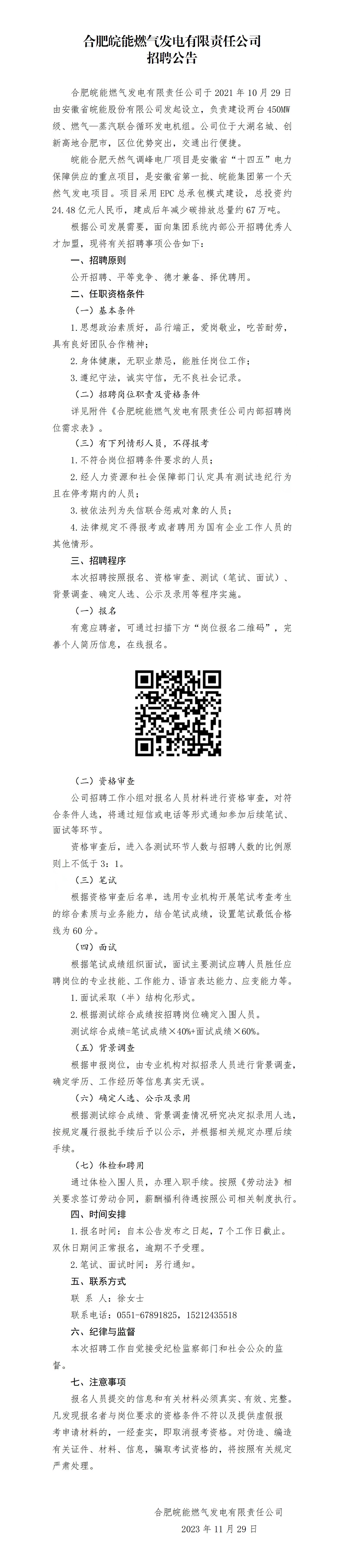 2023年合肥皖能燃?xì)獍l(fā)電有限責(zé)任公司招聘公告