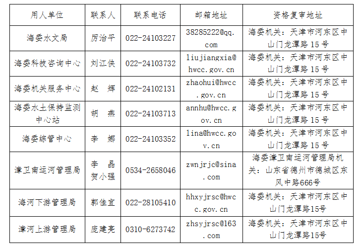 2.報(bào)名方法:考生填寫《水利部海委所屬事業(yè)單位公開招聘工作人員報(bào)名登記表》(附件2),通過電子郵件發(fā)送到用人單位,每位考生限報(bào)一個(gè)崗位。各用人單位對考生進(jìn)行資格審查,并通過電子郵件回復(fù)資格審查意見。