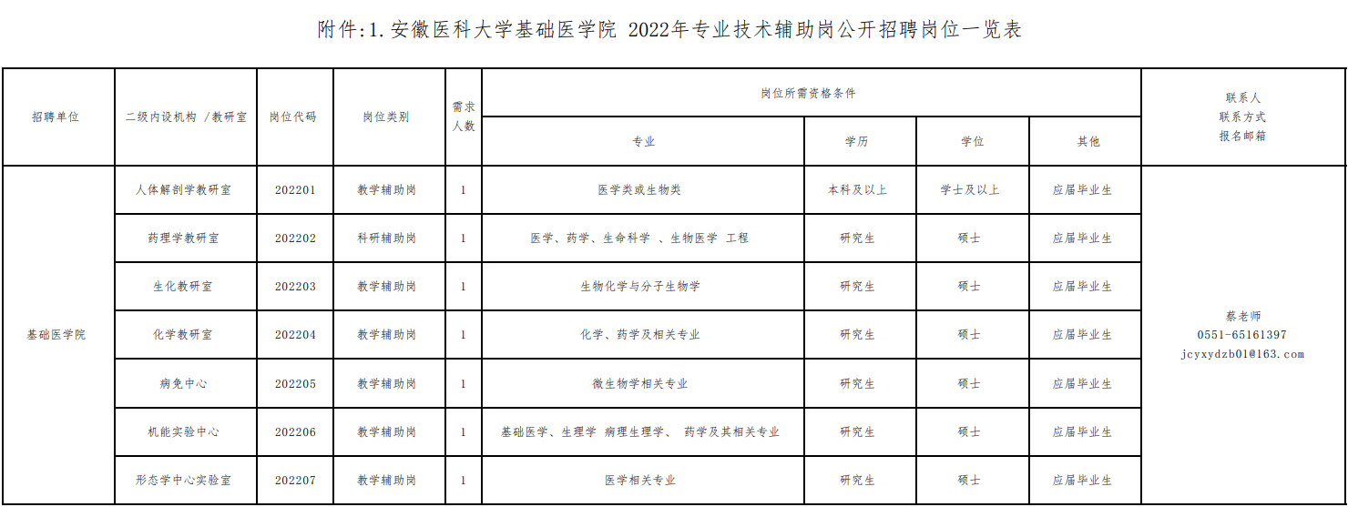 2022年安徽醫(yī)科大學(xué)基礎(chǔ)醫(yī)學(xué)院專(zhuān)業(yè)技術(shù)輔助崗公開(kāi)招聘崗位一覽表