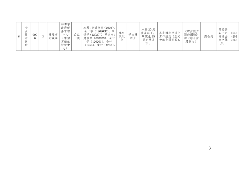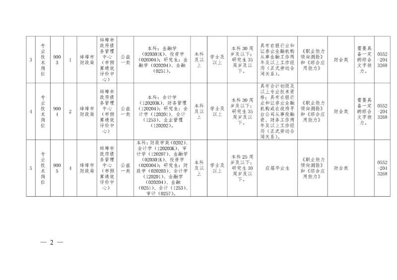 6 | 專業(yè)技術(shù)崗位 | 9006 | 3 | 蚌埠市財(cái)政局 | 蚌埠市政府債務(wù)管理中心(市預(yù)算績(jī)效評(píng)價(jià)中心) | 公益一類 | 本科:財(cái)政學(xué)類(0202)、會(huì)計(jì)學(xué)(120203K)、審計(jì)學(xué)(120207);研究生:財(cái)政學(xué)(020203)、會(huì)計(jì)學(xué)(120201)、會(huì)計(jì)(1253)、審計(jì)(0257)。 | 本科及以上 | 學(xué)士及以上 | 本科30周歲及以下;研究生35周歲及以下。 | 具有兩年及以上工作經(jīng)歷(正式勞動(dòng)合同關(guān)系)。 | 《職業(yè)能力傾向測(cè)驗(yàn)》和《綜合應(yīng)用能力》 | 財(cái)會(huì)類 | 需要具備一定的綜合文字能力。 | 0552-2043268 |