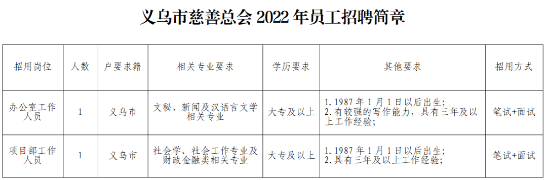 附件1:《義烏市慈善總會2022年員工招聘簡章》