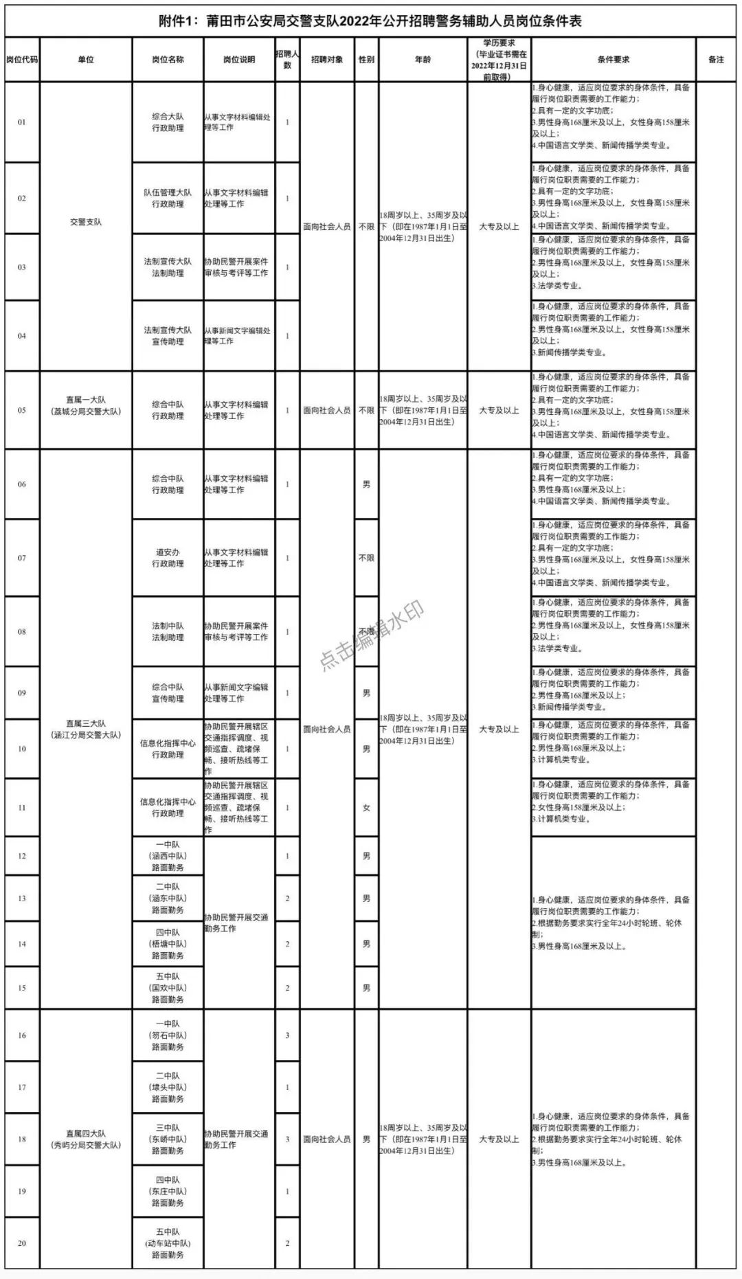 附件1.莆田市公安局交警支隊(duì)2022年公開招聘警務(wù)輔助人員崗位表