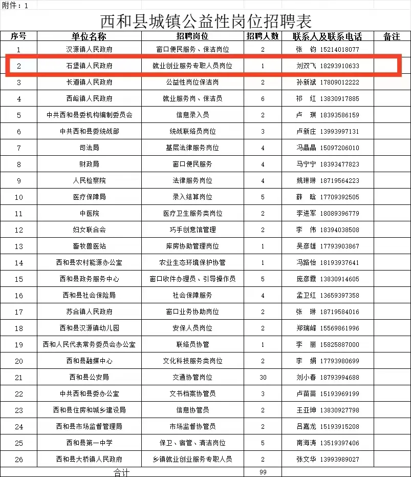備注:預(yù)報(bào)名人員僅限選擇其中一個(gè)崗位,報(bào)名時(shí)攜帶戶口本、身份證、就業(yè)創(chuàng)業(yè)證原件、西和縣城鎮(zhèn)公益性崗位申請表、鄉(xiāng)鎮(zhèn)社區(qū)公共就業(yè)服務(wù)機(jī)構(gòu)就業(yè)困難人員認(rèn)定表、學(xué)歷證明等相關(guān)資料報(bào)名。