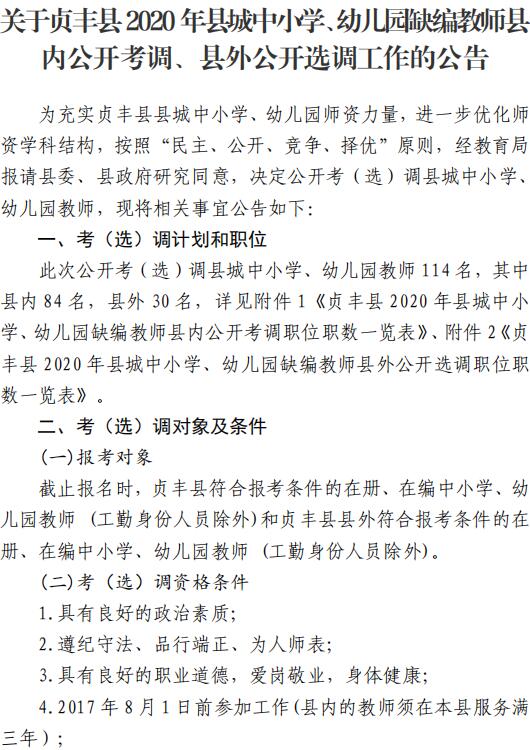 2020年黔西南貞豐縣縣城中小學(xué)、幼兒園缺編教師縣內(nèi)公開考調(diào)、縣外公開選調(diào)工作公告