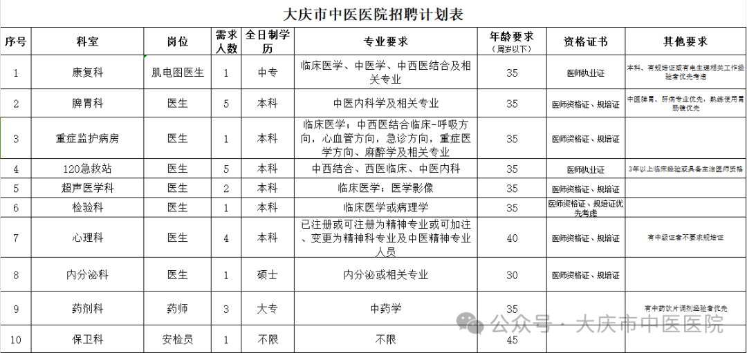 因工作需要,現(xiàn)大慶市中醫(yī)醫(yī)院擬招聘工作人員,具體要求如下: