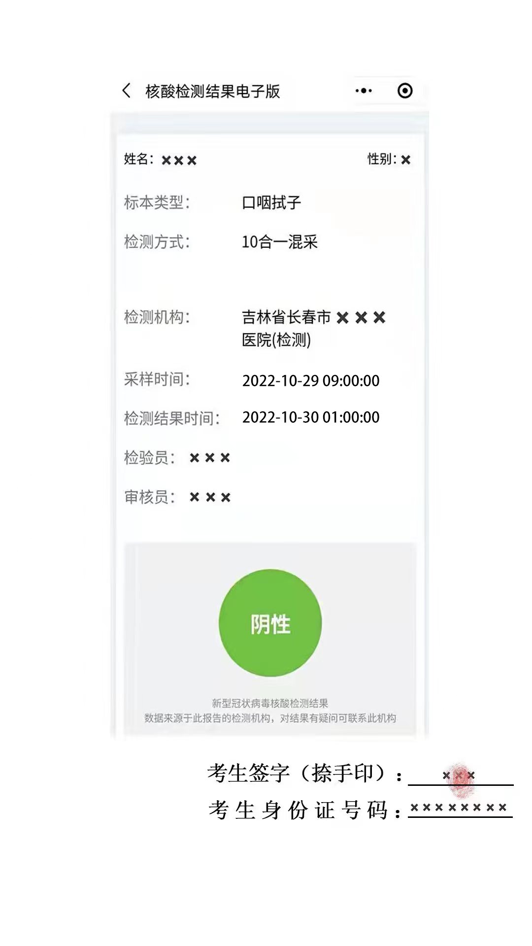 (三)所有應(yīng)試人員在進入考點時應(yīng)接受“吉祥碼”“通信大數(shù)據(jù)行程卡”“核酸檢測報告”查驗及體溫測量??忌仨殧y帶入場前24小時內(nèi)(以采樣時間為準)長春市檢測機構(gòu)出具的新冠病毒核酸檢測陰性證明參加考試。證明須為長春市有資質(zhì)的檢測機構(gòu)出具的,能明確顯示核酸檢測報告時間的紙質(zhì)報告或打印紙質(zhì)版的“吉事辦”小程序核酸檢測結(jié)果截圖(圖例見附件5,需注明姓名、身份證號并由本人簽字捺手印)。