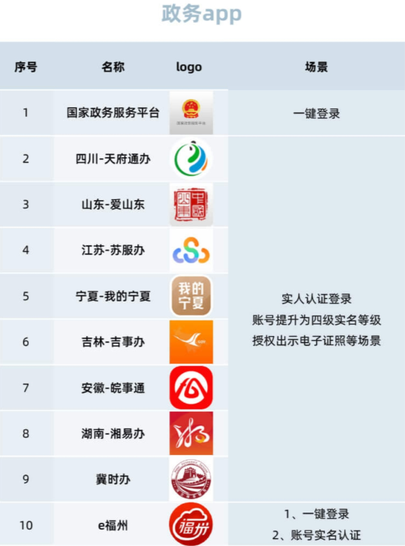 目前,國家網(wǎng)絡(luò)身份認證公共服務(wù)正處于試點階段,已上線試點App和場景共67個,包括部分政務(wù)App和互聯(lián)網(wǎng)App,如國家政務(wù)服務(wù)平臺、中國鐵路12306、淘寶、微信、小紅書、QQ等,附官方支持名單如下: