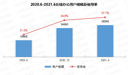 截至2021年6月,我國在線辦公用戶規(guī)模達3.81億,較2020年12月增長3506萬,占網(wǎng)民整體的37.7%。
