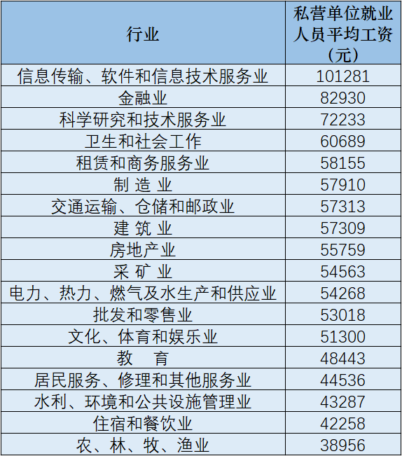從私營單位就業(yè)人員平均工資來看,排在前三位的分別是“信息傳輸、軟件和信息技術服務業(yè)”“金融業(yè)”“科學研究和技術服務業(yè)”。排名后三位的分別是“水利、環(huán)境和公共設施管理業(yè)”“住宿和餐飲業(yè)”“農(nóng)、林、牧、副、漁業(yè)”。