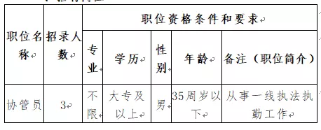3、協(xié)管員具有符合職位要求的文化程度與工作能力,退伍軍人可放寬至高中畢業(yè)學(xué)歷,年齡可放寬至40周歲(1979年11月23日至2002年11月23日期間出生)。