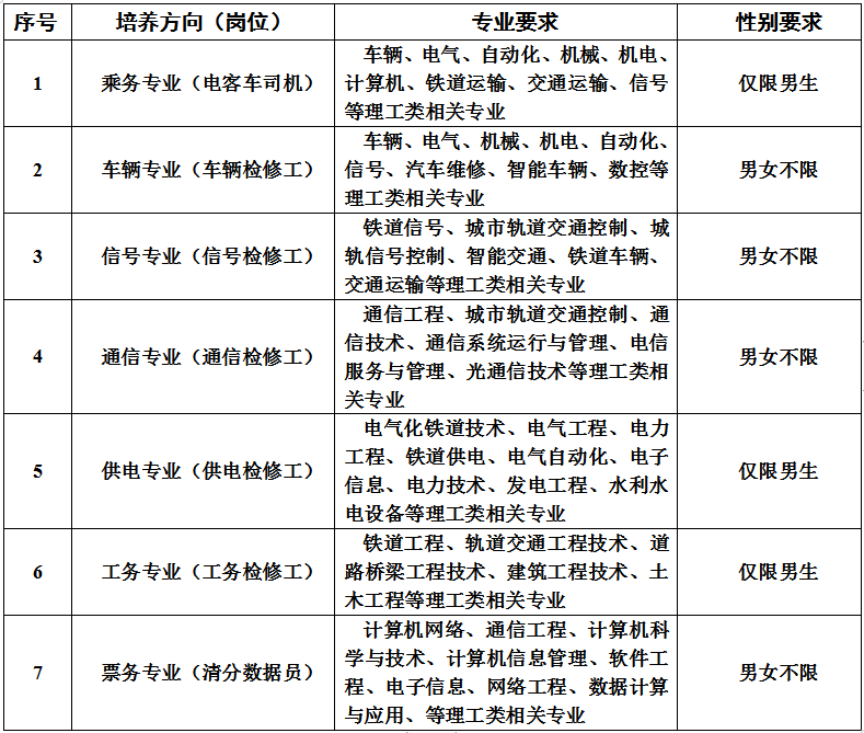 注:軌道交通相關(guān)專業(yè)優(yōu)先、具備相關(guān)技術(shù)崗位工作經(jīng)驗(yàn)優(yōu)先。每人限報(bào)一所院校一個(gè)專業(yè),重復(fù)報(bào)名視為無效。