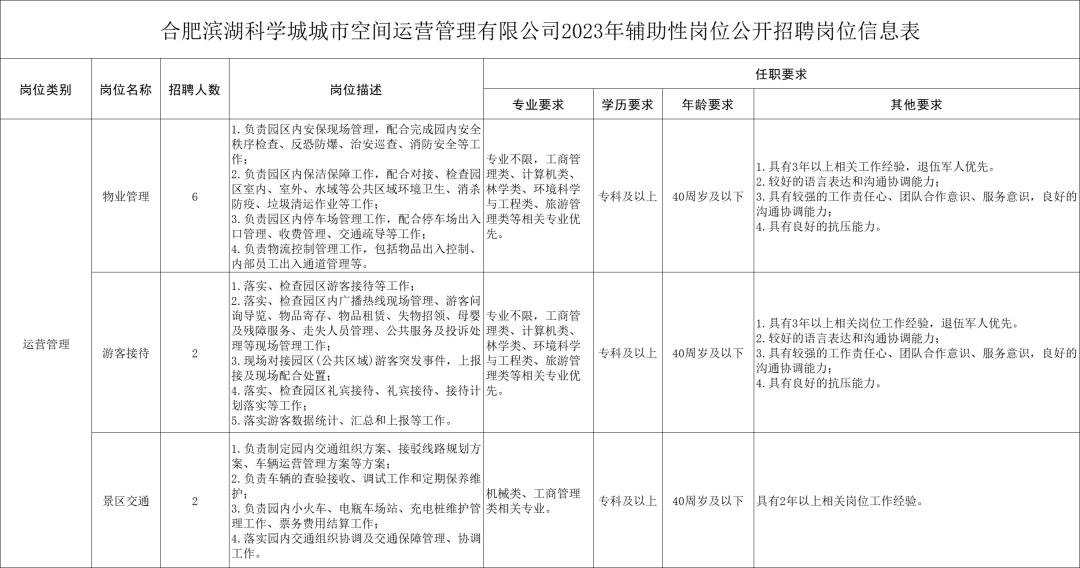 因工作發(fā)展需要,合肥濱湖科學(xué)城城市空間運(yùn)營(yíng)管理有限公司現(xiàn)面向社會(huì)公開(kāi)招聘輔助性崗位工作人員10名,現(xiàn)將有關(guān)事項(xiàng)公告如下: