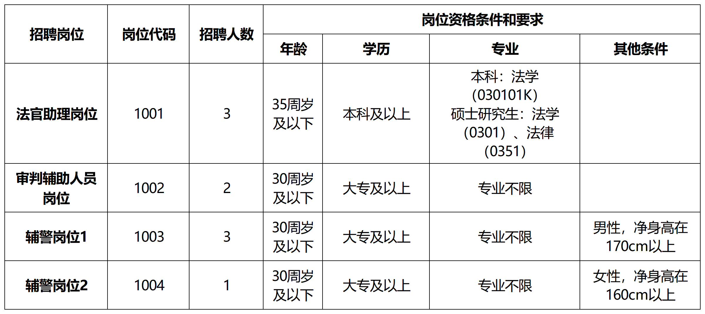3.新聘人員試用期為1個月,試用期滿合格后簽訂勞動合同。本次招聘的工作人員,法官助理崗位(1001崗)每人每年12萬元左右(含社會保險、公積金和工會福利等費用);審判輔助人員崗位(1002崗)和輔警崗位1(1003崗)、輔警崗位2(1004崗)每人每年6.3萬元左右(含社會保險、公積金和工會福利等費用)。