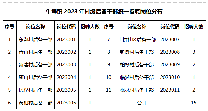 本次招考面向全鎮(zhèn)共招聘15名村級(jí)后備干部,具體崗位計(jì)劃如下: