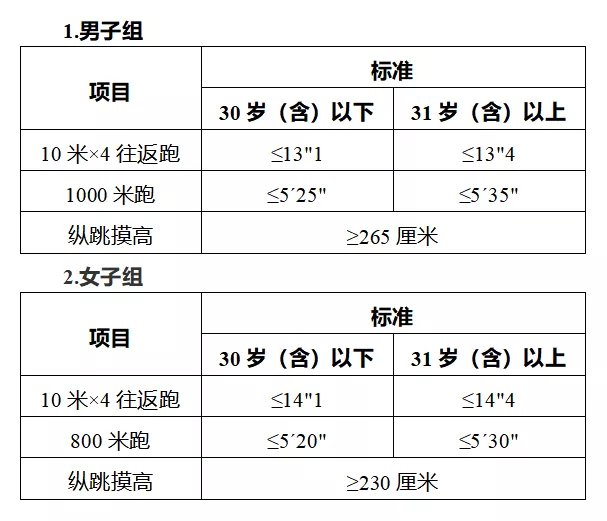 體能測試項目包括:1000米(800米)跑、4×10米往返跑、縱跳摸高,兩項以上測試達(dá)標(biāo)視為體能合格。具體評分標(biāo)準(zhǔn)如下: